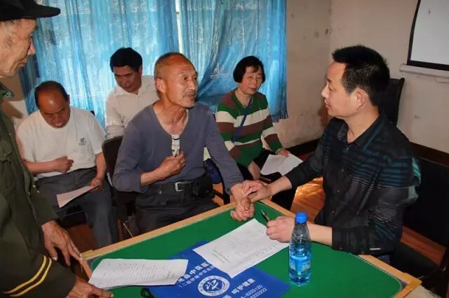 (吴谋军书记正在为老人们做中医体质辨识 把脉看舌苔)